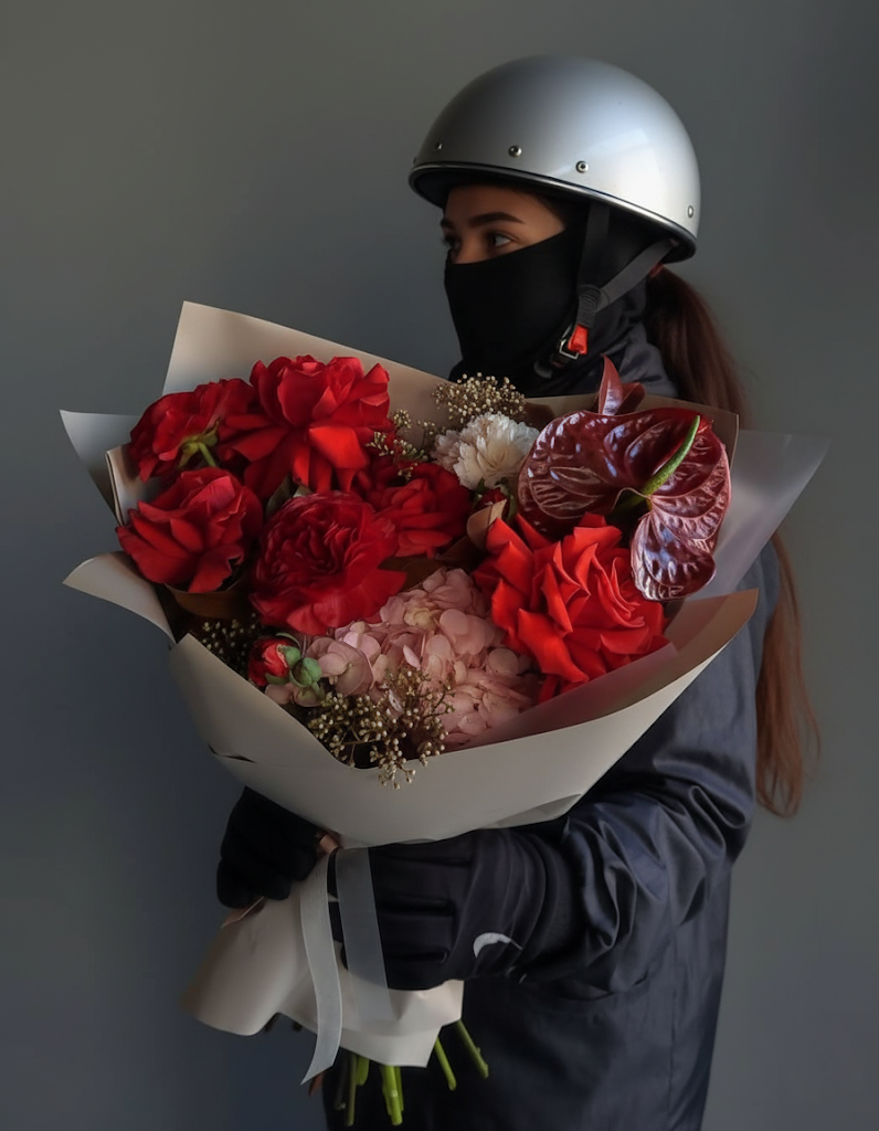 Этот букет — это пульс большого города осенью: динамичный, смелый и полный контрастов. Я соединила классические французские розы и нежные ранункулюсы с экзотическим, глянцевым антуриумом. Его форма в виде сердца глубокого винного цвета — главный акцент композиции. Пышная гортензия и диантус служат мягким фоном, на котором разворачивается эта игра фактур и насыщенных осенних красок.