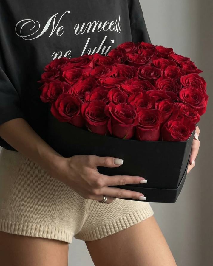 O întruchipare clasică a pasiunii și a sentimentelor profunde într-o interpretare modernă. Cele 37 de fire de trandafiri catifelați, aranjați compact, creează o textură impecabilă în interiorul unei cutii negre elegante în formă de inimă. Contrastul dintre roșul intens al petalelor și fundalul întunecat oferă compoziției un dramatism și un farmec aparte. Acest cadou va vorbi despre iubire mai bine decât orice cuvânt, fiind simbolul ideal al devotamentului și admirației.