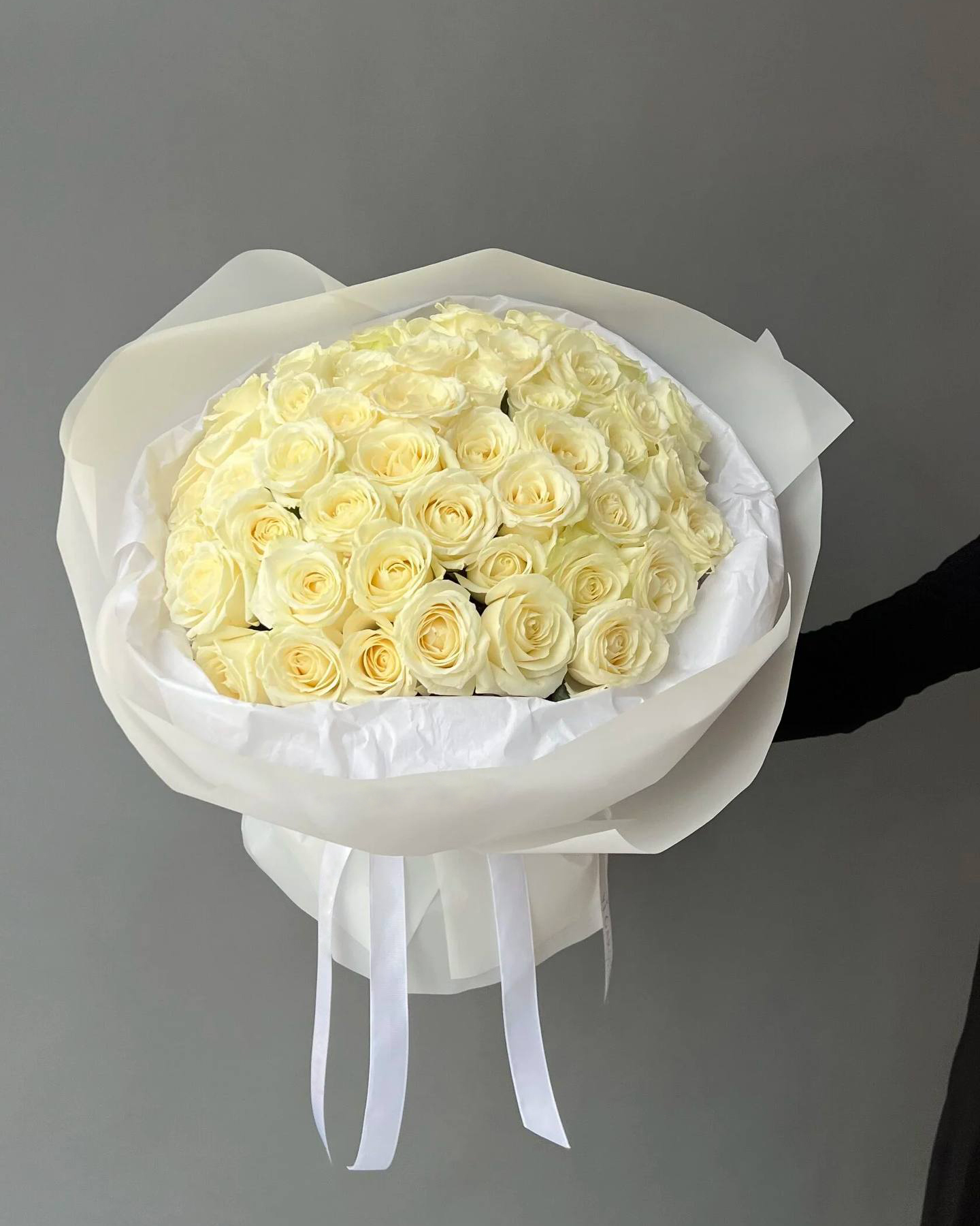 Этот букет — это настоящая симфония, где каждая нота — это безупречный бутон белой розы. Я собрала сорок пять отборных роз с лепестками цвета слоновой кости в огромное, пышное облако, как воплощение чистой, незамутненной роскоши. Белая упаковка лишь подчеркивает их аристократизм, не отвлекая от идеальной формы.