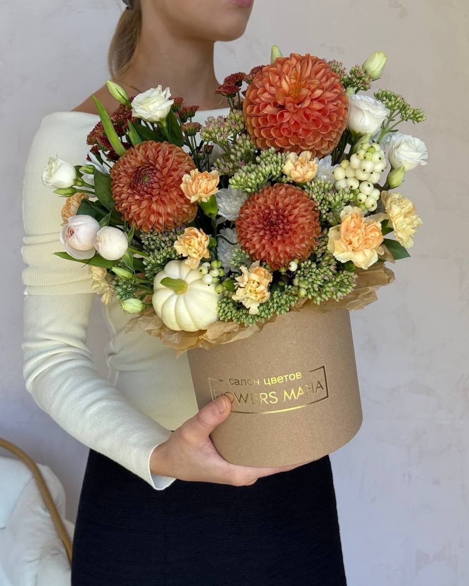Эта композиция - это настоящая квинтэссенция щедрой и уютной осени, собранная в стильной крафтовой коробке. В центре - яркие шары оранжевых георгин, напоминающие о последних теплых днях. Их окружают нежные розы, хризантемы и диантусы в персиковых и кремовых тонах. Я добавила множество интересных фактур - сочный очиток, белоснежные ягоды симфорикарпоса и, конечно, главный символ сезона - маленькую декоративную тыковку.