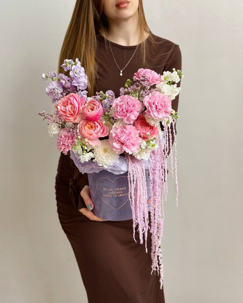 Эта композиция - это воплощение девичьих грез и романтики, собранное в стильной розовой коробке. Я создала сложный и интересный микс фактур: здесь и пушистая хризантема, и кружевные диантусы двух видов, и нежные пионовидные розы. Ароматная маттиола добавляет воздушности, а ниспадающая ветка амаранта придает букету легкий богемный шарм и изысканность.