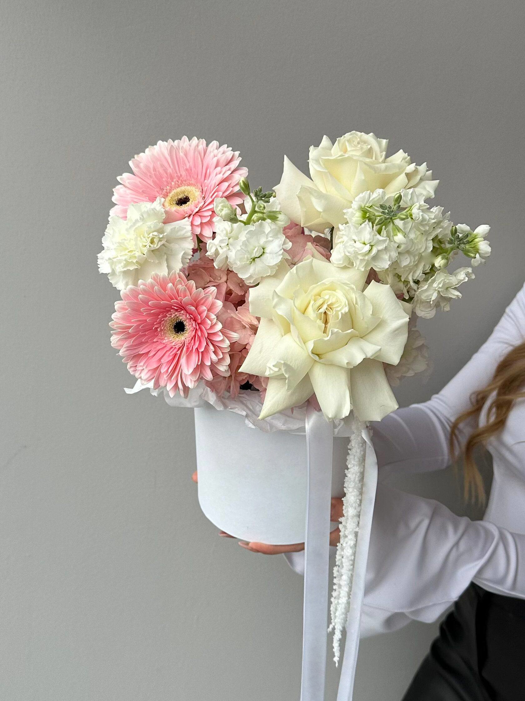 Эта композиция — это нежная мелодия, сыгранная на лепестках самых любимых цветов. Я собрала в ней роскошные французские розы и пышную гортензию, чтобы создать богатую основу, а наивные герберы добавили солнечную, радостную нотку. Ароматная маттиола и кружевной диантус наполняют композицию воздухом, свежестью и сладким запахом.