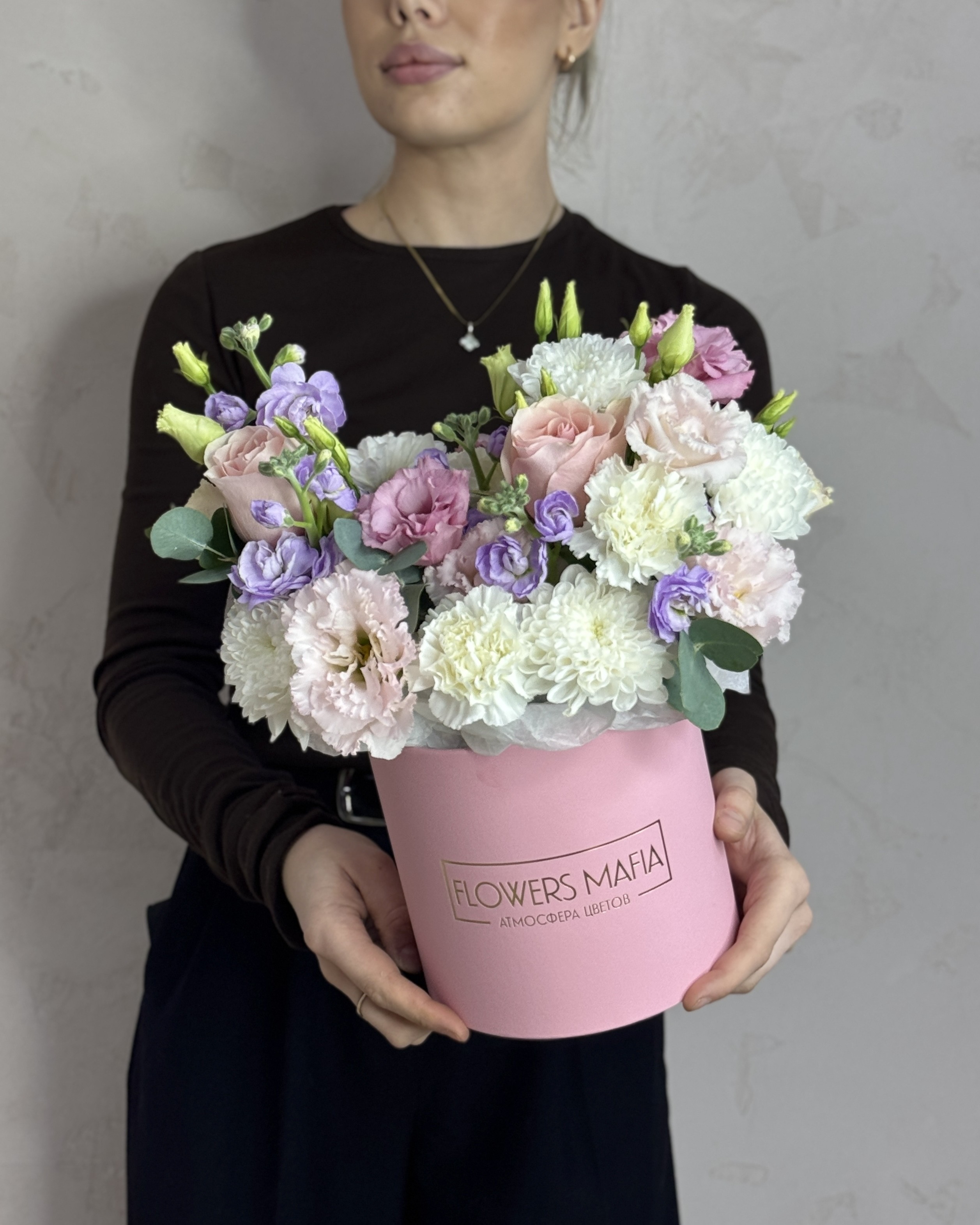 Этот букет - это изящный комплимент, собранный из множества разных цветов, которые гармонично дополняют друг друга. Я соединила в нем благородные розы, трепетную эустому, пышную хризантему и ароматную маттиолу. Кружевные диантусы добавляют композиции легкости, а веточка эвкалипта - свежести и стильного акцента.